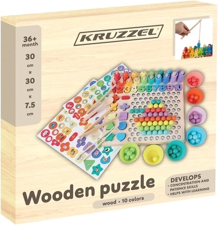 Zabawna i edukacyjna drewniana mozaika z koralikami, liczbami i kształtami rozwija dziecięcą wyobraźnię, myślenie logiczne oraz małą motorykę. Dzięki bogatemu zestawowi akcesoriów (patyczki, pęseta, łyżeczka, magnetyczna wędka, karty) oferuje długie godziny twórczej zabawy, ćwiczy liczenie, kolory i kształty oraz wspiera koordynację oko–ręka, a także cierpliwość i koncentrację.