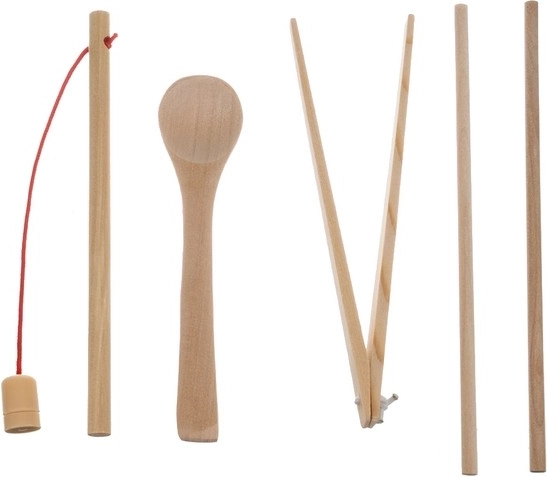 - drewniana podstawa, 3 dwustronne plansze, drewniana nakładka, 7 foremek, pęseta, wędka, łyżeczka, patyczki, 8 magnetycznych rybek, 5 znaków matematycznych, 10 cyfr, 5 kształtów, 55 kółeczek, 77 kuleczek