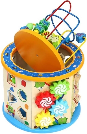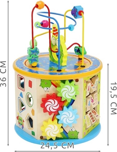 Kulkowy labirynt, sorter kształtów, zębatki, liczydło, liczby, zegar, labirynt i panel do zabawy – wszystko w jednej stabilnej kostce.