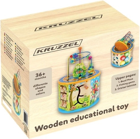 Górna część z koralikowym labiryntem służy do treningu chwytu i małej motoryki, natomiast boczne panele oferują sorter kształtów, zębatki, liczydło, liczby, labirynt i inne aktywności. Spód kryje grę planszową „Chińczyk” z pionkami i kostkami w zestawie – idealną do wspólnej rodzinnej zabawy.