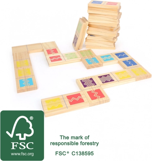 Ciesz się wielką porcją zabawy z dominem XXL wykonanym z wysokiej jakości drewna FSC. Zestaw 28 elementów oferuje grę na dopasowywanie kolorów i wzorów, rozwija małą motorykę, logikę i percepcję barw. Elementy są duże, solidne i bezpieczne dla dzieci od 3 lat. Idealne do zabawy w domu i na zewnątrz. Certyfikacja FSC, 28 ekstra dużych elementów, kolorowe i kreskowane wzory, odpowiednie dla najmłodszych.