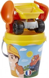 Zabawny zestaw do piasku dla małych budowniczych zawiera wiaderko, sito, ciężarówkę, grabki i łopatkę. Idealny na plac zabaw i plażę, o średnicy wiaderka 17 cm i wysokości 18 cm.