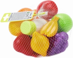 Rekwizyty żywnościowe w siatce, idealne do zabawy dla dzieci. Zawiera różnorodne rodzaje owoców, które rozwijają wyobraźnię Twojego dziecka.