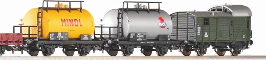 Skład obejmuje mieszankę wagonów towarowych DB epoki III – wagon kryty, platformę i cysterny – do zmiennych zestawień i realistycznych scenariuszy towarowych na Twojej trasie.
