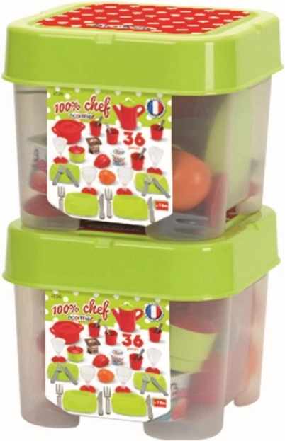 Kompletny zestaw obiadowy w pudełku dla małych kucharzy zawiera wszystko, co potrzebne do serwowania poczęstunku. Znajdziesz w nim talerze, sztućce, kubeczki, filiżanki, dzbanek z pokrywką, garnek z pokrywką oraz owoce i jogurt. Świetny wybór na rozwój wyobraźni, zabawy w odgrywanie ról i motorykę małą.