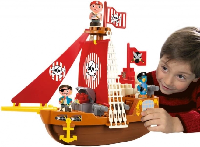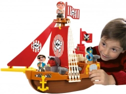 Statek jest wyposażony w dopracowane elementy, takie jak czerwone żagle z motywem czaszki i skrzyżowanych kości, które zapewnią dzieciom autentyczne pirackie wrażenia.
