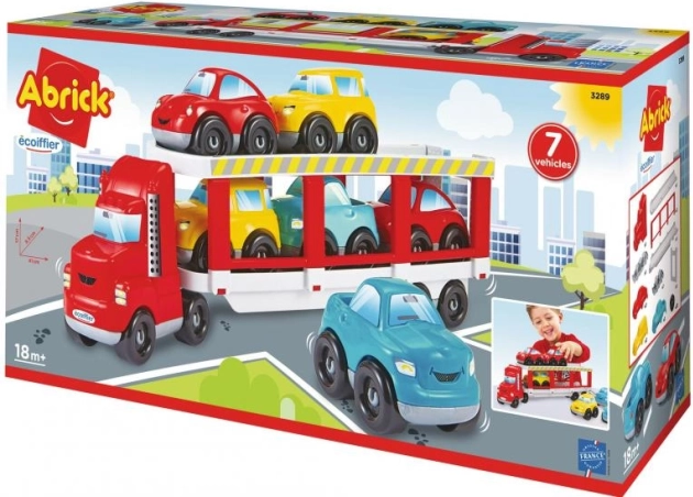 Atracyjny Abrick transporter do transportu samochodzików! Transporter jest wyposażony w składną rampę, która umożliwia łatwe załadunek i rozładunek sześciu kolorowych samochodzików.