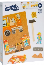 Odkryj zabawną grę do wbijania z korkową tablicą, drewnianymi elementami i młotkiem, która rozwija dziecięcą wyobraźnię i umiejętności. Dzieci ułożą z elementów własny plac budowy lub scenę transportową i przymocują ją pinezkami. W zestawie znajdują się także obrazkowe wzory dla inspiracji, wszystko schowane w praktycznym pudełku. Wspiera kreatywność, motorykę małą i koncentrację.