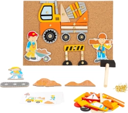 Korkowa tablica z pinezkami umożliwia wielokrotne układanie i przearanżowywanie scen transportowych i budowlanych zgodnie z wyobraźnią dzieci.