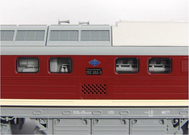 Wierny i detaliczny model lokomotywy spalinowo‑elektrycznej BR 132 „Ludmilla” w barwach DR. Wyróżnia się m.in. detalami odmiennymi od innych wariantów, takimi jak poręcze na czole, detale okien czołowych i bocznych oraz wykonanie dachu. Malowanie i nadruki, obejmujące wszystkie elementy dekoracyjne, są najwyższej jakości, zgodne z linią produktową Expert. Model wyposażono w wydajny silnik z kołami zamachowymi, a moment przenoszą diagonalnie rozmieszczone ogumowane koła na wewnętrznych osiach wózków; napędzane są jednak cztery osie. W połączeniu z długą, odlewaną z cynku ramą zapewnia to wyjątkowe własności jezdne. Białe/czerwone oświetlenie LED zmienia się w zależności od kierunku jazdy, oświetlona jest także kabina maszynisty. Model można rozbudować dedykowanym dekoderem cyfrowym z modułem dźwiękowym i głośnikiem. Dostępne są również wagony odpowiedniego typu i wykończenia. Główne cechy: sześć osi napędowych silnik z dwoma kołami zamachowymi para ogumowanych kół napędowych światła z przełączaniem barwy zależnie od kierunku jazdy oświetlenie wnętrza złącze PluX22 wg NEM 658 gniazdo wg NEM 362 z kinematyką krótkiego sprzęgu Dokumentacja: Broszura do modeli BR 132/BR 232 (DE) Ogólne informacje o BR 130 (DE, EN, F, NL) Test modelu w magazynie Miniaturbahnen 2/2018 (DE) Instrukcja obsługi i lista części zamiennych modelu nr 52760 (DE, EN, F, NL)