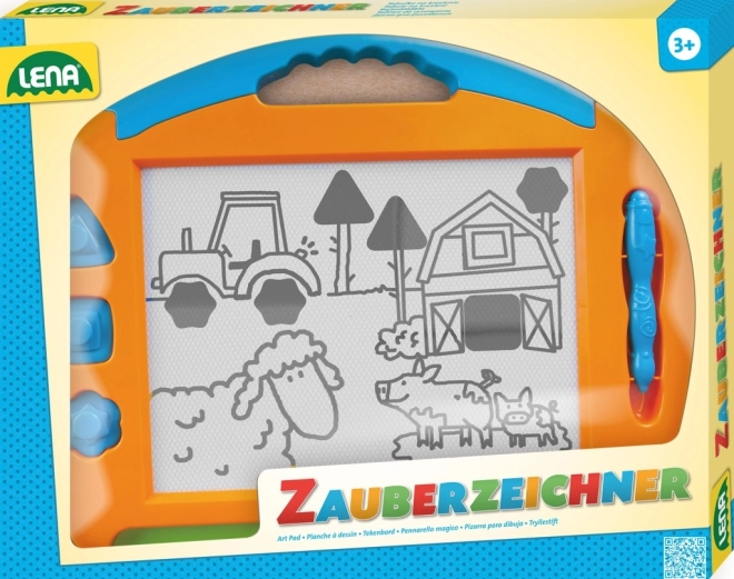 Ta magnetyczna tablica to idealna zabawka do pierwszych rysunków i nauki kształtów. Dzięki praktycznemu przesuwnemu suwakowi obrazek można w okamgnieniu zmazać i zacząć od nowa – bez bałaganu i bez papieru. Rysik z metalową końcówką jest przymocowany sznurkiem, więc się nie zgubi, a trzy magnetyczne stempelki pomagają tworzyć zabawne wzory.