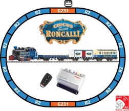 Ten kompletny zestaw kolejowy zawiera wszystko do natychmiastowej jazdy: lokomotywę parową, wagon osobowy, kryty i odkryty wagon towarowy, owal torów z podsypem oraz zasilanie z bezprzewodowym analogowym kontrolerem. Pociąg w atrakcyjnym wzornictwie RONCALLI zachwyca realistycznym wyglądem i niezawodną pracą.