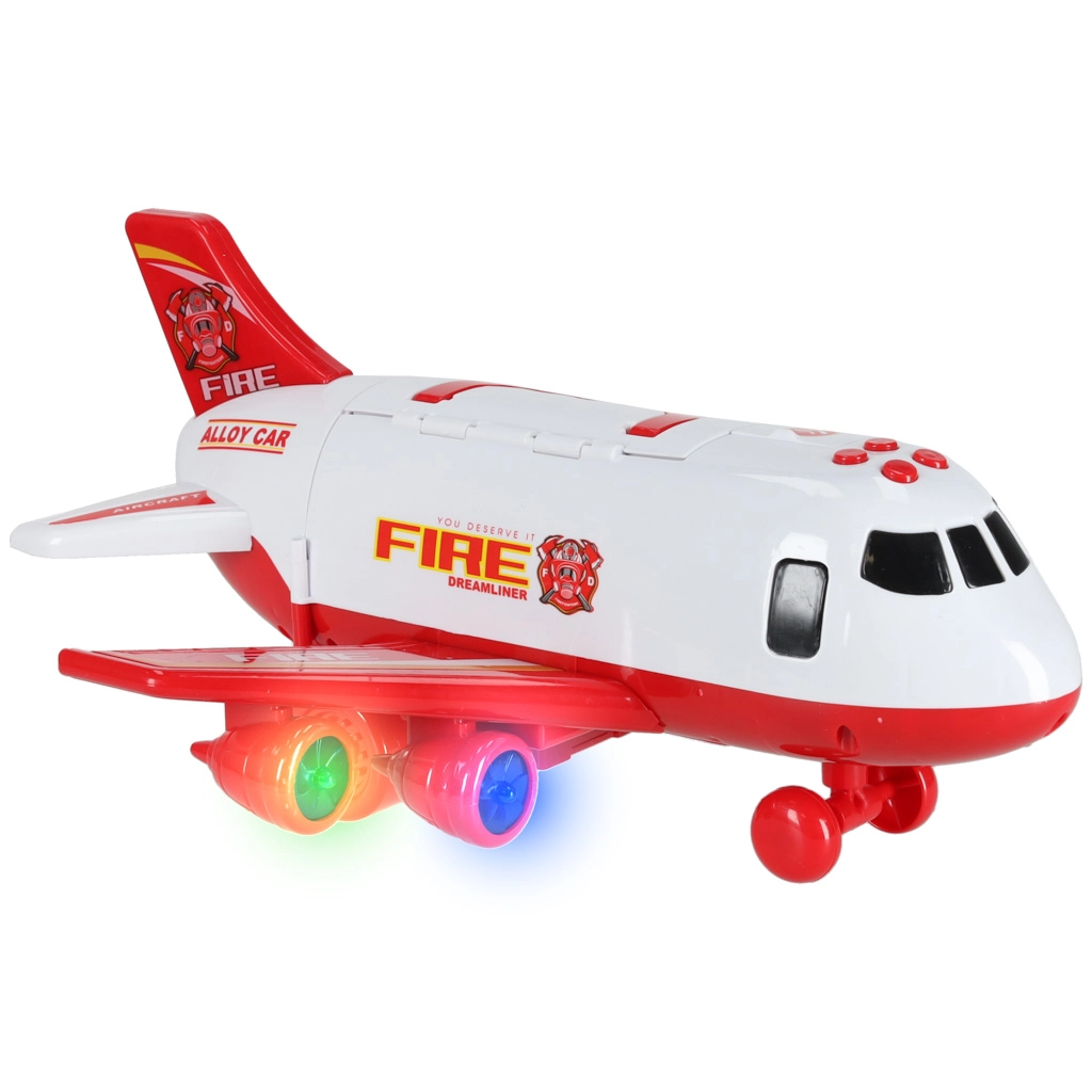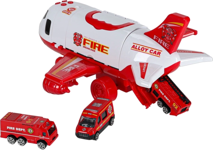 W komplecie są 3 wozy strażackie oraz zestaw 7 znaków drogowych. Wszystko mieści się wewnątrz samolotu, więc masz porządek i gotowość do drogi.