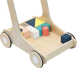 24 klocki o różnych kształtach znajdują się w wózku, co daje dzieciom niezliczone możliwości twórczej zabawy. Wózek ma nowoczesny design z niebieską rączką i białymi ilustracjami.
