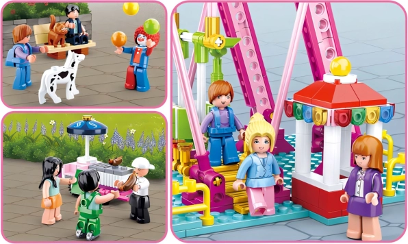Dominantą zestawu jest duży różowo-niebieski diabelski młyn z działającą rotacją i wieloma gondolami. Dzieci z łatwością rozkręcą atrakcję i stworzą realistyczną atmosferę wesołego miasteczka.