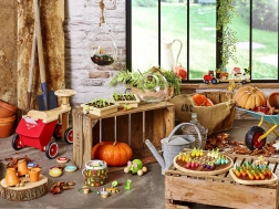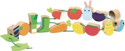 - 14 drewnianych koralików z motywami farmy (warzywa, owoce, zwierzątka, kalosze itp.)