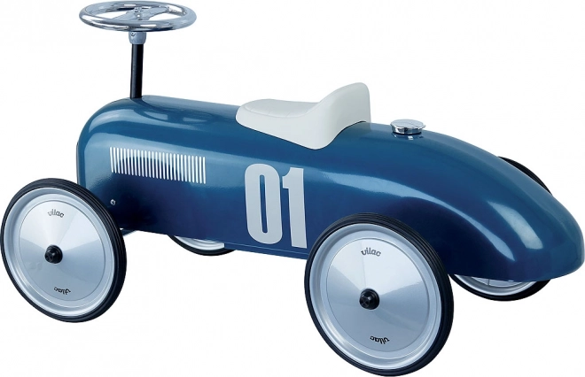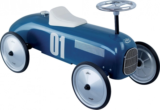 Stylowa vintage biegówka, łącząca metalową konstrukcję z atrakcyjnym niebieskim kolorem, idealna dla najmłodszych miłośników aut.