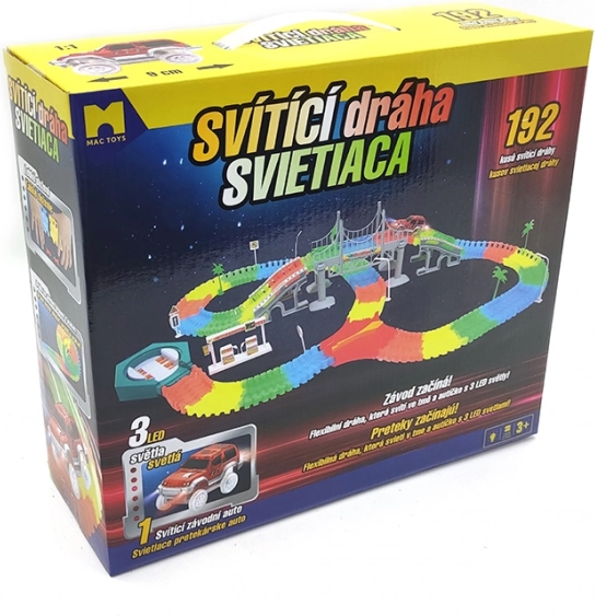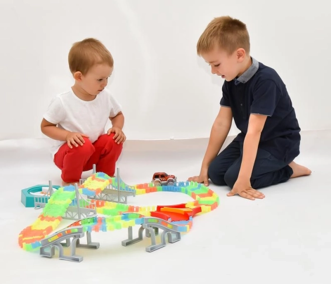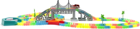 Zbuduj własny tor wyścigowy z 192 kolorowych elementów i ciesz się jazdą z autkiem LED, które rozświetli każdy zakręt. Elementy są elastyczne i łatwo się zatrzaskują, dzięki czemu dzieci mogą szybko zmieniać kształt i długość toru oraz eksperymentować z mostami, zakrętami i zjazdami.