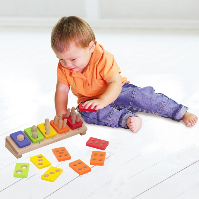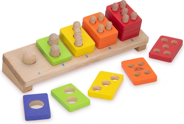 Każdy kolorowy element ma liczbę otworów odpowiadającą cyfrze na podstawie. Dzieci w naturalny sposób ćwiczą liczby 1–5 oraz porównywanie ilości.