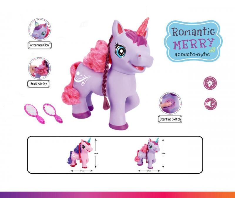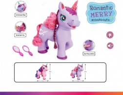 Uroczy fioletowy jednorożec na baterie ucieszy dzieci swoimi efektami – po naciśnięciu przycisku na brzuszku zacznie śpiewać angielską piosenkę, wydaje magiczne dźwięki, a jego róg świeci. W zestawie znajdują się grzebyk i lusterko do czesania długiej grzywy.