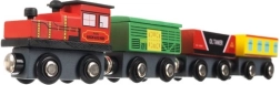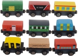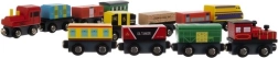 Zestaw zawiera 3 lokomotywy i 9 wagoników w różnych kolorach, oferując tym samym różnorodną zabawę.