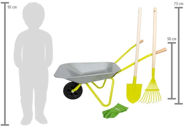 • Praktyczne wymiary: taczka ok. 79 × 36 × 50 cm, wysokość uchwytów 50 cm; długość łopaty i grabi ok. 73 cm.