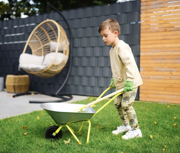 Metalowa skrzynia, solidna rama i jednokołowa konstrukcja ułatwiają manewrowanie. Dzieci z łatwością przewiozą liście, ziemię i drobne narzędzia dzięki pojemności ok. 10 litrów i udźwigowi do 15 kg.