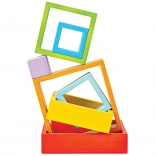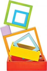 Ten wszechstronny zestaw oferuje nieskończone kombinacje – bez instrukcji, tylko z wyobraźnią. Dzieci mogą wkładać kwadraty według rozmiaru, budować wieże, tworzyć mozaiki i kolorowe ramki dla swoich prac, a po zabawie nawet ozdobić nimi pokój. Solidne drewno i gładkie krawędzie zapewniają przyjemny chwyt i długą żywotność zabawki.