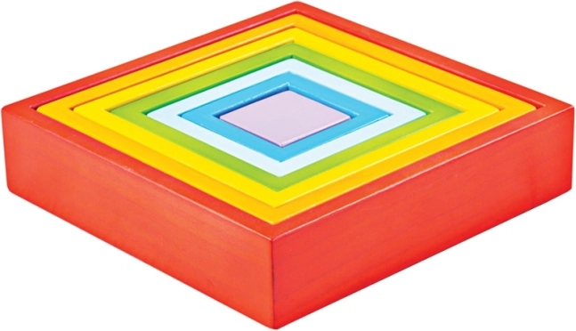 Tęczowa paleta i stopniowo zmniejszające się kwadraty uczą dzieci rozróżniania kolorów, rozmiarów i kształtów. Idealne do pierwszego sortowania i nazywania.