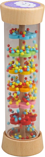 Deszczowy wałek Bigjigs Baby to zabawka sensoryczna, która zachwyca dzieci kojącym szumem i żywymi kolorami. Wewnątrz przezroczystego cylindra kuleczki przemieszczają się po kolorowych dyskach, naśladując delikatny deszcz. Oba końce zdobią urocze motywy słońca i chmurki, wspierające percepcję wzrokową.