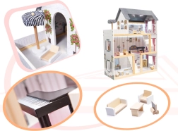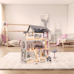 Stylowy drewniany domek dla lalek z płyty MDF w eleganckim czarnym kolorze oferuje trzy piętra pełne zabawy, bogaty zestaw mebli oraz nastrojowe oświetlenie LED. Dzięki solidnej konstrukcji z MDF jest stabilny i trwały, a 16 elementów mebli pozwala kreatywnie urządzić kuchnię, salon, sypialnię, łazienkę i taras na dachu.