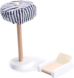 Taras na dachu z leżakiem i pasiastym parasolem jest idealny do relaksu Twoich lalek i dopełnia realistyczne scenki z życia.