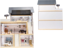 Trzypiętrowy domek dla lalek o wysokości 78 cm został zaprojektowany do długich godzin kreatywnej zabawy. Realistyczne nadruki wnętrz, schody i otwarta konstrukcja zapewniają łatwy dostęp do wszystkich pomieszczeń. Zintegrowana listwa świetlna LED pięknie rozświetla pokoje i tworzy przytulną atmosferę podczas zabawy.
