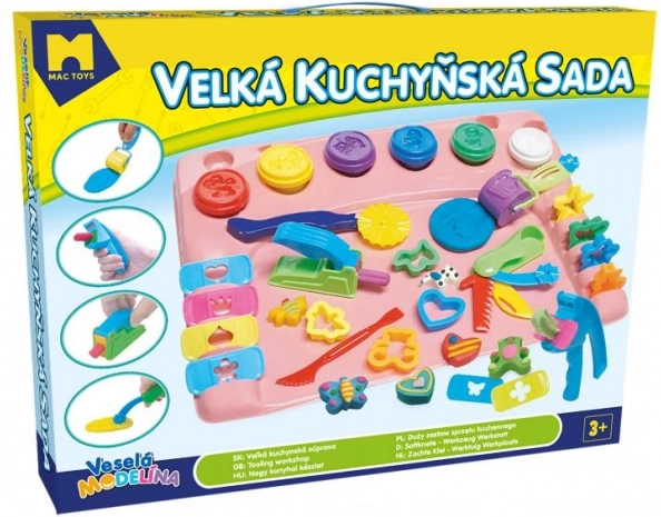 Odkryj kreatywny świat z dziecięcym zestawem Modelo – duży kuchenny zestaw z podkładką i 31 elementami akcesoriów, uzupełniony o 6 kubeczków masy plastycznej w podstawowych kolorach. Dzieci mogą ciąć, formować i dekorować swoje dzieła, a podkładka chroni stół i pomaga utrzymać porządek. Świetny do rozwijania motoryki małej, kreatywności i wyobraźni.