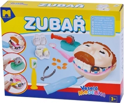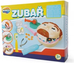 - Narzędzia dentystyczne (wiertarka, szczypce, lusterko, szczoteczka), forma do zębów, wielokolorowa masa plastyczna