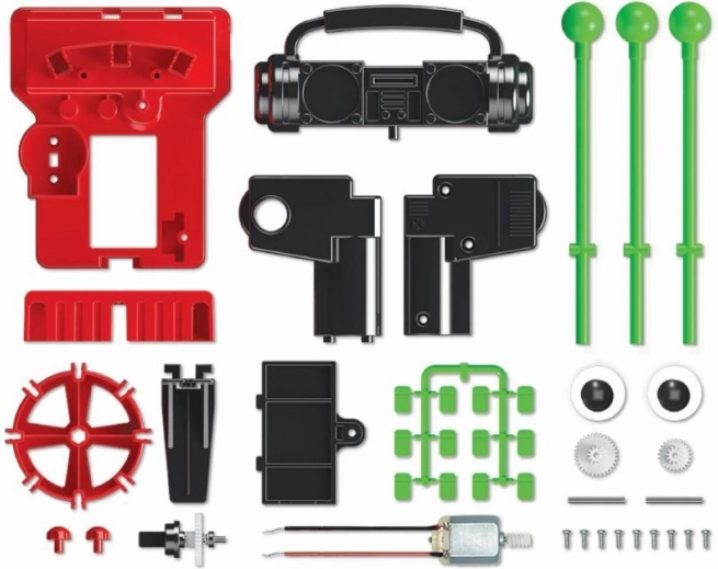 Zestaw zawiera kolorowe plastikowe części i zielone pręty, które montowane są w robota zdolnego grać na bębnach. Proces montażu wspiera myślenie logiczne i zręczność manualną, co jest doskonałym sposobem na połączenie zabawy z nauką.