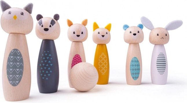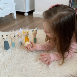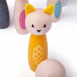 Spraw dzieciom radość stylowym zestawem kręgli z uroczymi zwierzątkami – sową, borsukiem, jeleniem, kotem, niedźwiedziem i królikiem. Kolorowe figurki z wysokiej jakości certyfikowanego drewna FSC są gładkie, przyjemne w dotyku i odporne na codzienną zabawę. Zestaw nadaje się do zabawy w domu – na dywanie i na gładkiej podłodze.