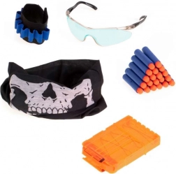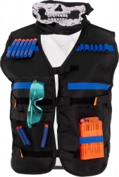 Kompletny zestaw dla dzieci do piankowych strzałek: wygodna taktyczna kamizelka z uchwytami i kieszeniami, 20 piankowych strzałek, plastikowy magazynek na 6 strzałek, opaska na nadgarstek na amunicję, ochronne okulary w niebieskim kolorze oraz bandana. Kamizelka ma oddychającą siateczkę, uniwersalny dziecięcy rozmiar i regulowane zapięcie na rzep dla wygodnego noszenia.