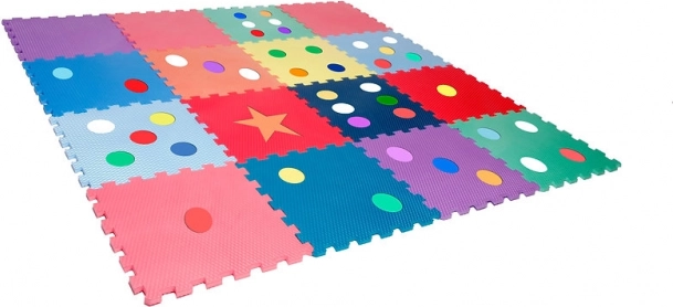 Żywe kolory i kształty (kropki, gwiazda) wspierają percepcję sensoryczną oraz rozwój małej i dużej motoryki. Pianka amortyzuje upadki i chroni przed chłodem podłogi.