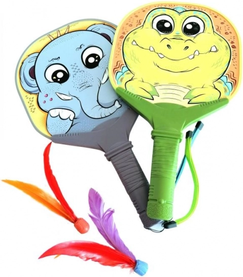 Paletki z piłeczkami z piórkami z motywem zwierzątek.