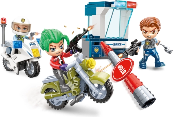 W zestawie znajduje się dynamiczna scena z policyjnym motocyklem w pościgu za złoczyńcą na motorze.