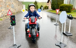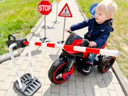 Dzieci w prosty i przyjemny sposób poznają podstawowe znaki drogowe oraz bezpieczne zachowanie w ruchu podczas zabaw na miasteczku drogowym.