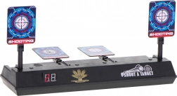 Wyświetlacz LED czytelnie zlicza punkty, a po trafieniu wszystkich czterech celów tarcze same się podnoszą – gra płynnie trwa bez ręcznego ustawiania.