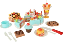 - Zawartość zestawu (75 szt.): 6× kawałek tortu, 5× świeczka, 14× bezy, 7× pałeczka cukrowa, 4× wisienka, 4× mandarynka, 3× truskawka, 3× kiwi, 4× króliczek, 1× napis, 3× talerzyk, 3× ciasteczko, 3× kawałek rolady, 3× babeczka, 1× filiżanka, 1× łyżeczka, 1× widelec, 1× nożyk, 1× łopatka do tortu, 1× pucharek do lodów, zestaw naklejek, zestaw rzepów.