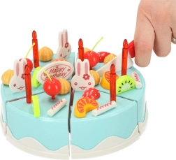 Ten kolorowy zestaw z niebieskim tortem urodzinowym idealnie nadaje się do zabaw w przyjęcie i do dziecięcej kuchni. Tort składa się z 6 kawałków łączonych rzepem, więc dzieci mogą kroić go dołączonym plastikowym nożem, przestawiać i ponownie ozdabiać. Bogate akcesoria – od świeczek i owoców po urocze króliczki i napis „Happy Birthday” – pobudzają kreatywność i rozwój wyobraźni.