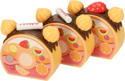 Sześć kawałków tortu jest połączonych rzepem – dzieci łatwo pokroją je plastikowym nożem i złożą z powrotem. Idealne do ćwiczenia małej motoryki i realistycznej zabawy.