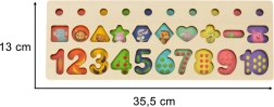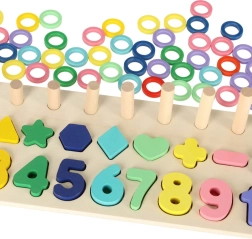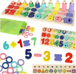Ten zestaw Montessori łączy radość z układania z nauką. Dzieci dopasowują drewniane figury geometryczne i cyfry do odpowiednich otworów, a jednocześnie nakładają na kołki kolorowe krążki, których liczba odpowiada danej cyfrze. Dzięki przejrzystej drewnianej podstawie nauka jest naturalna i przyjemna.