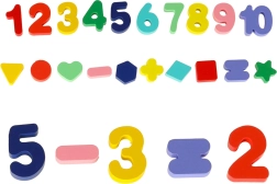 Dzieci dopasowują kolorowe kształty i cyfry do właściwych miejsc, ćwicząc rozróżnianie wzrokowe, logikę oraz słownictwo (kolory, kształty, liczby).