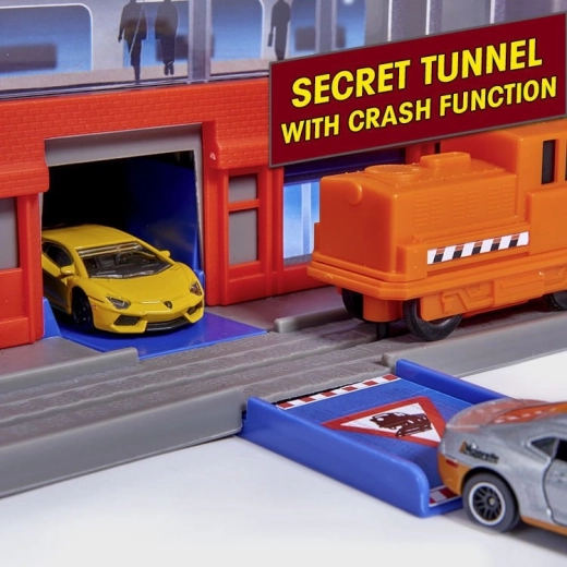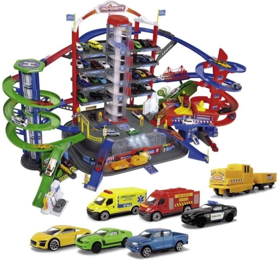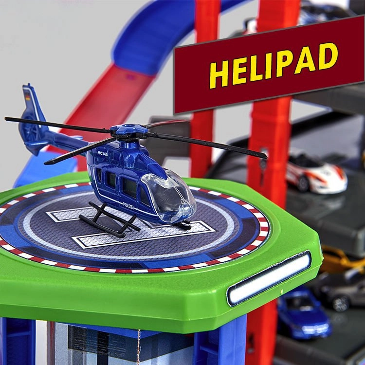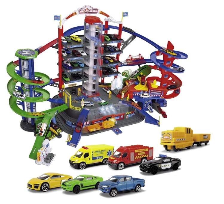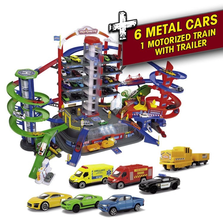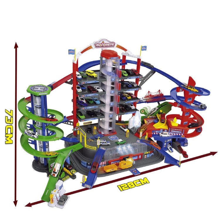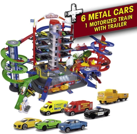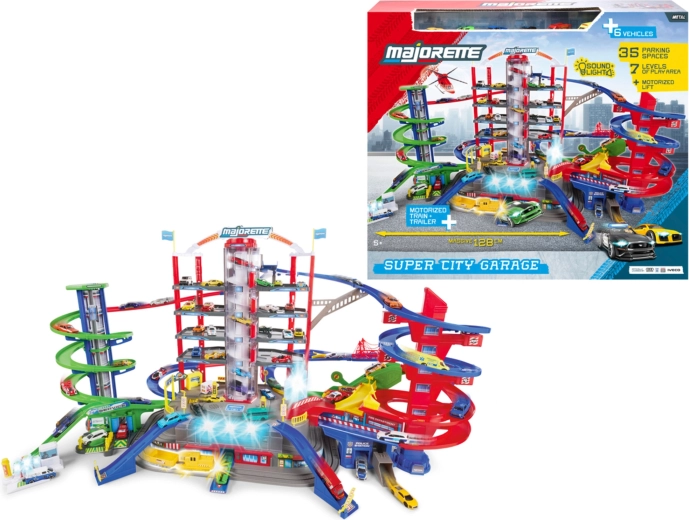 Ten duży zestaw garażowy oferuje dzieciom nieskończone możliwości zabawy na siedmiu poziomach. Kolorowe spiralne tory, winda zasilana bateriami oraz realistyczne efekty świetlne i dźwiękowe wciągną w akcję każdego małego miłośnika aut i pociągów. Metalowe autka z swobodnie toczącymi się kółkami poruszają się płynnie po rampach, a lokomotywa z wagonem przejeżdża przez tajemniczy tunel i zatrzymuje się na stacji kolejowej.