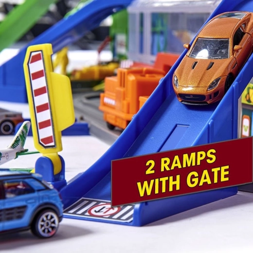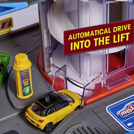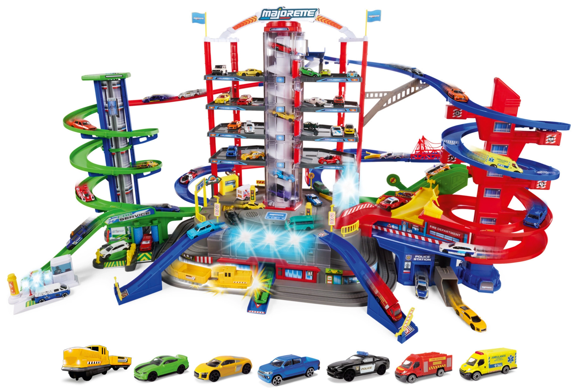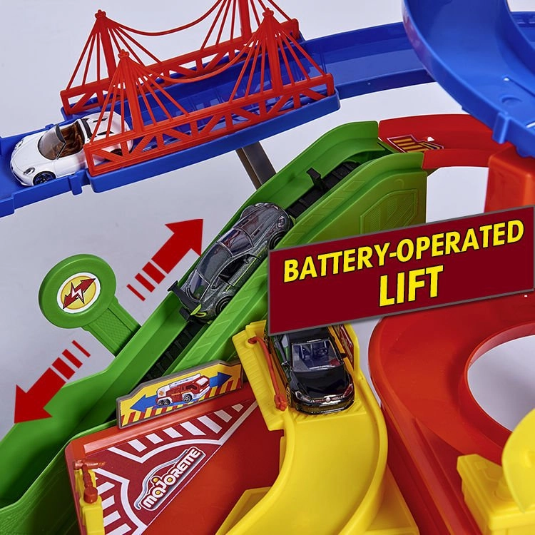 Rozległe strefy parkowania, wielopoziomowe tory i centralna wieża z windą zapewniają długie godziny zabawy i wyścigów.
